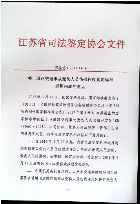 一、自2017年3月23日起,我省司法鉴定机构进行道路交通事故受伤人员伤残程度评定,应适用最高人民法院、最高人民检察院、公安部、国家安全部、司法部于2016年4月18日发布的《人体损伤致残程度分级》。
