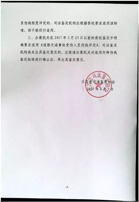 针对《道路交通事故受伤人员伤残评定》废止后鉴定标准的争议问题,江苏省司法鉴定协会发布<关于道路交通事故受伤人员伤残程度鉴定标准适用问题的意见>,明确了道路交通事故受伤人员伤残程度评定的三条意见。