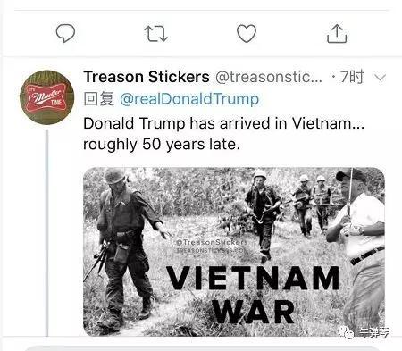 要知道,就在特朗普这条“感谢河内人民”推特下面。第一条留言是一个叫“Treason Stickers”的美国人,配了一张越南战争的图片,留言文字是:
