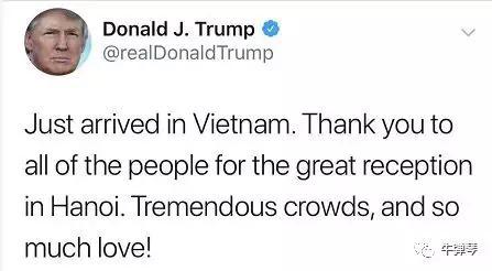 终于,北京时间26日晚10时,特朗普发了他在越南的第一条推特,三句话: