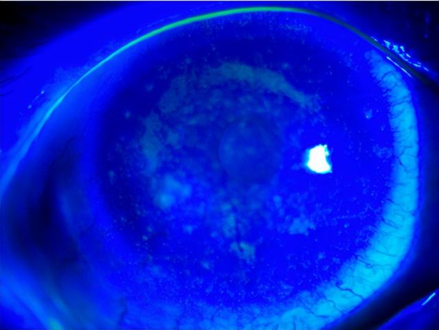 医生检查后发现,小静的眼角膜不仅出现了水肿、缺氧的情况,还“爬满”了大量新生血管;双眼睑缘红肿,结膜充血;睑板腺开口部分堵塞,油脂污浊;角膜散在大小不等的白色病灶,荧光素染色可见弥漫染色。