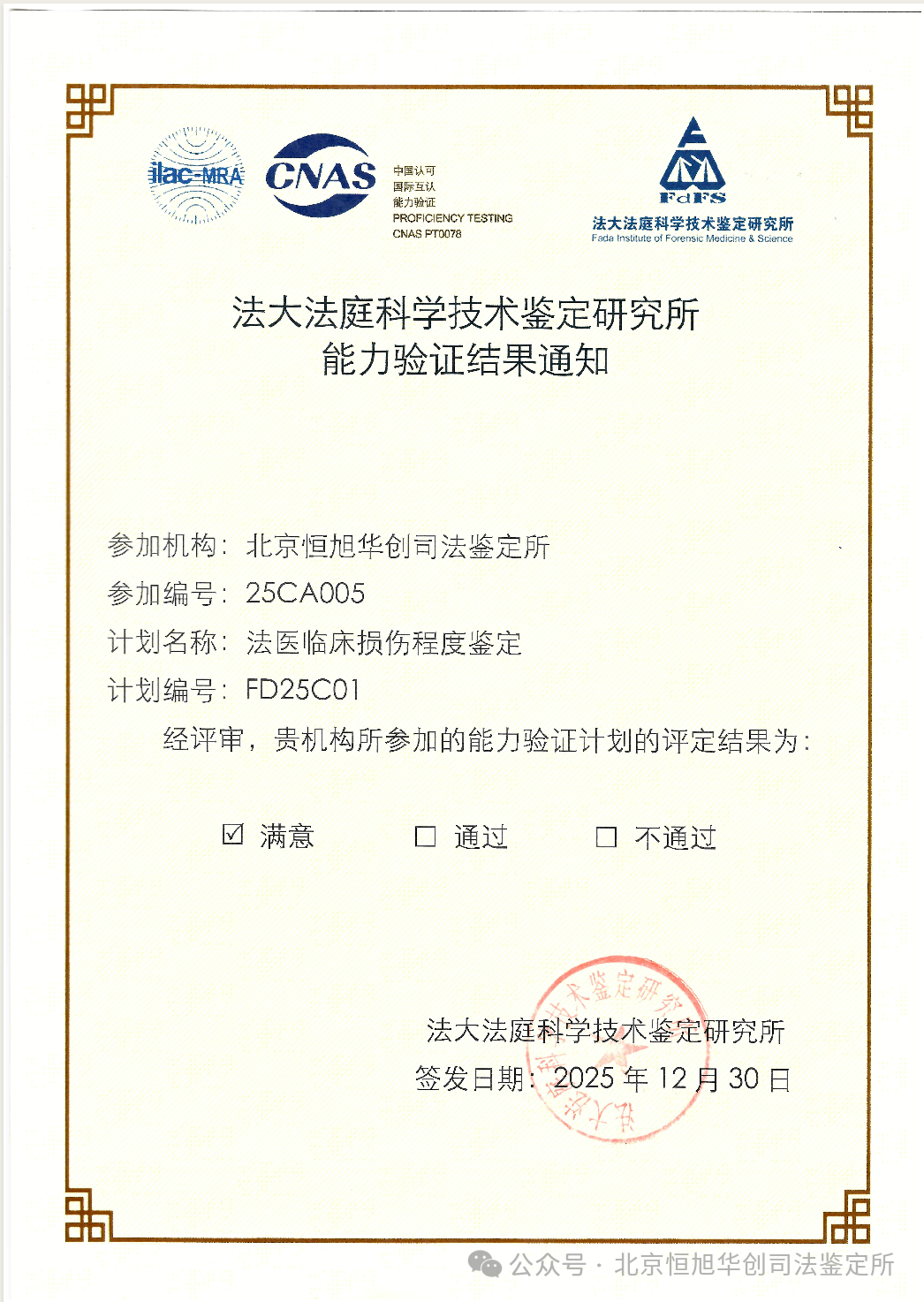 2025年度北京恒旭华创司法鉴定所-能力验证考核全优通过