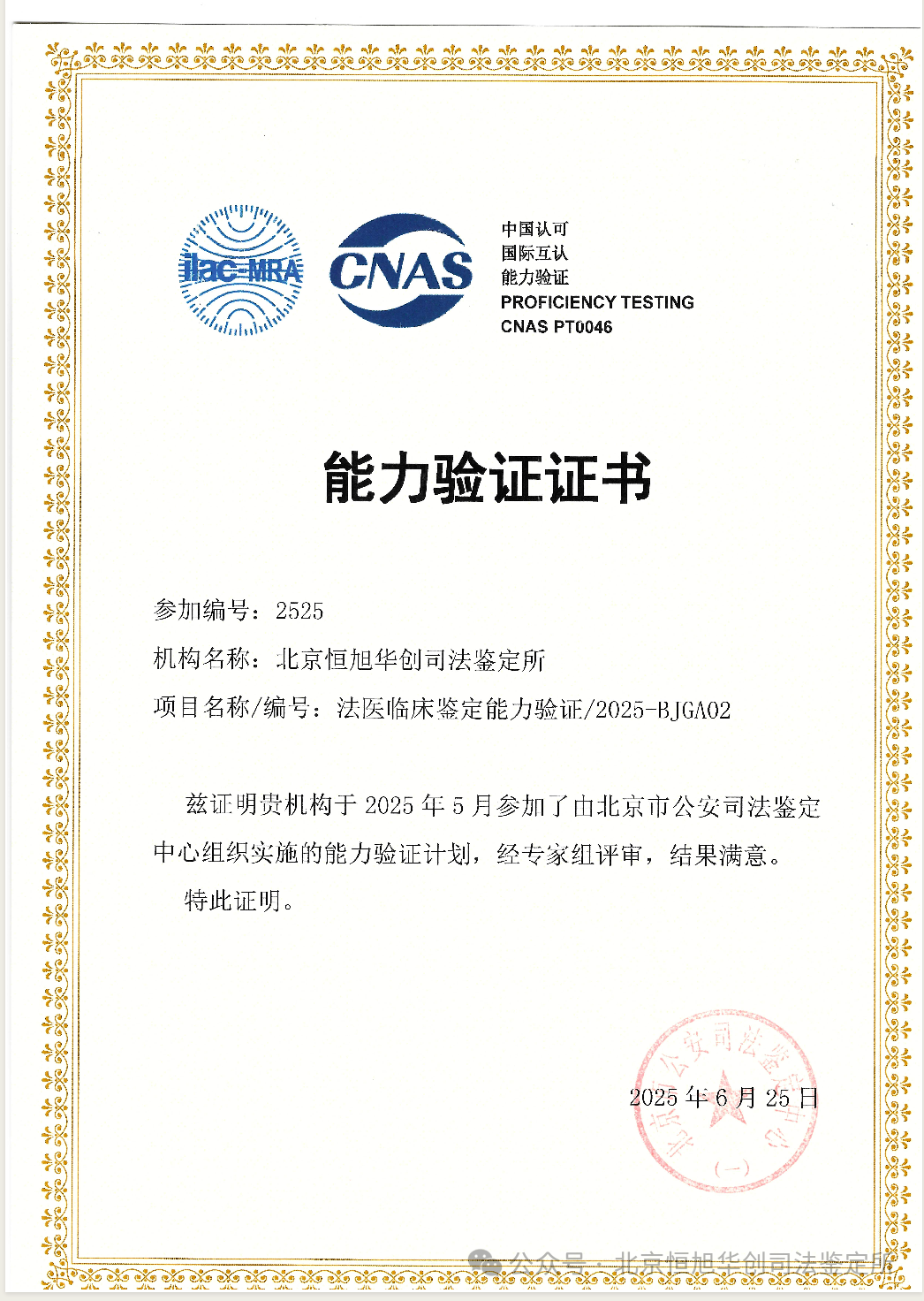 2025年度北京恒旭华创司法鉴定所-能力验证考核全优通过