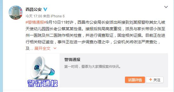 9月14日晚17点,西昌市公安局官微对事件作出回应:9月10日11时许,西昌市公安局长安派出所接到刘某报警称其女儿被天使幼儿园园长老公蔡某某性侵。接报后我局高度重视,派员与家长带领小孩至州一医院及州二医院作相关检查,并进行调查取证,固定相关证据。目前正在进行相关物证鉴定,事件正在进一步调查办理之中,公安机关将依法严肃查处,及时通报办理情况。>>女大学生醉酒被抬酒店遭性侵后死亡,检方决定不起诉,怎么回事?