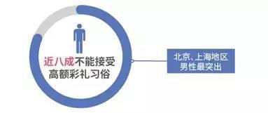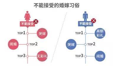 各地的婚嫁习俗也是跨地域婚恋的青年男女必须要面对的问题。据调查显示,在各种婚嫁习俗中,单身女性最不能接受的前三名依次是哭嫁、闹婚和无彩礼,而单身男 性最不能接受的前三名依次是高额彩礼、哭嫁和闹婚,其中有高达近八成的男性不能接受高额彩礼习俗,且北京、上海地区男性最突出。高额彩礼的城市中,北京、 上海、杭州居前三,彩礼金额高达11万到20万之间。