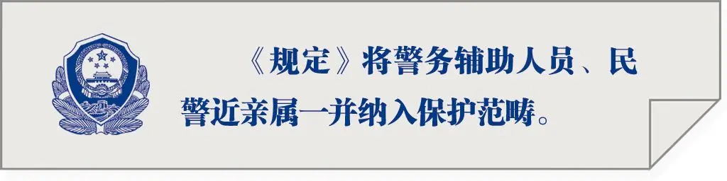 第三条规定,民警及其近亲属的人身财产安全不因民警依法履行职责、行使职权行为受到威胁、侵犯等;第三十一条规定,警务辅助人员在协助民警依法履行职责、行使职权过程中受到不法侵害的,参照本规定开展相关工作。较以往各种“维权”,该条例将受益主体不断延伸,包含民警亲属及协助开张执法活动的辅警。现实中,一旦民警依法履职被侵害,无论身体还是精神都受到巨大伤害,家人的生命财产安全也受到巨大威胁,严重影响家庭的正常生活。同时,这份规定也直接表明“警务辅助人员可以协助民警开展执法活动”,并且侵犯正在协助民警执法的辅警的行为也将收到法律追责。