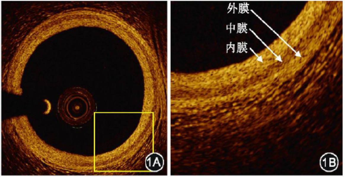 图4 OCT图像冠脉的三层结构(1B为1A中方块的放大图)